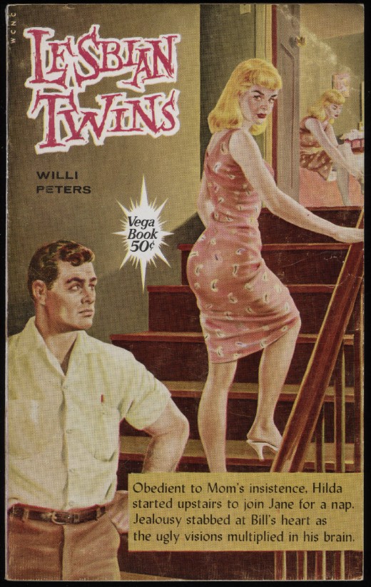 Upstairs, Jane's door is open. She is on either the salmon-colored bathtub, or the salmon-colored bed. It’s hard to tell. She is either shaving her legs or putting on her shoes or taking them off, as she awaits her lesbian sister Hilda who is on the third stair in her form fitting salmon colored sleeveless dress. Again, it is hard to tell. One thing is for certain: Jane’s dress matches Hilda’s to a T.